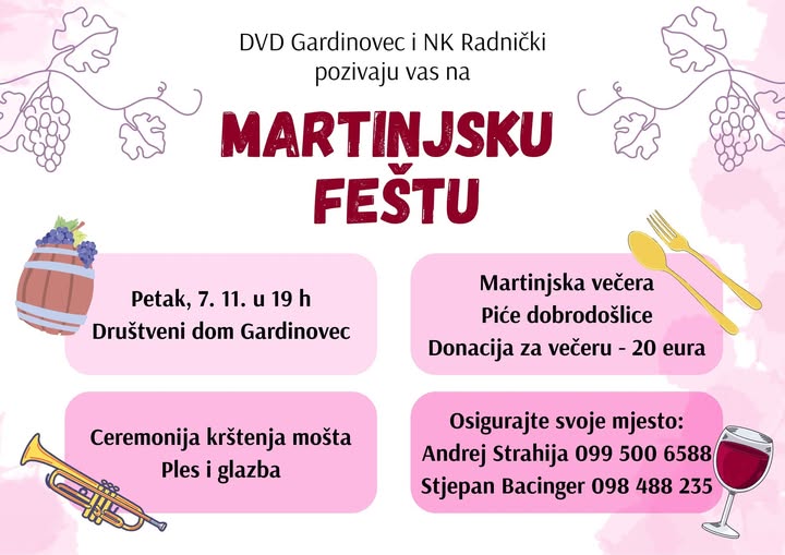 DVD Gardinovec i NK Radnički pozivaju sve zainteresirane na Martinijsku feštu koja će se održati u petak, 7. studenoga, s početkom u 19 sati u Društvenom domu Gardinovec.