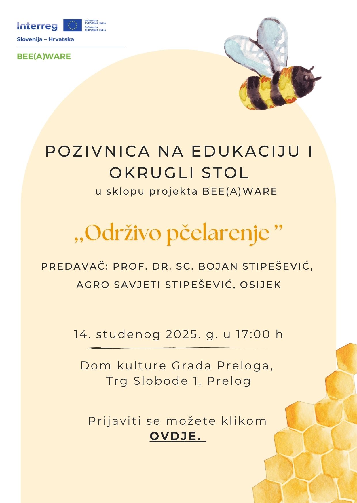 U sklopu međunarodnog projekta BEE(A)WARE (Interreg Slovenija – Hrvatska), u Domu kulture Grada Preloga održat će se značajan događaj posvećen jednoj od najvažnijih tema u agronomiji i zaštiti okoliša: „Održivo pčelarenje“.