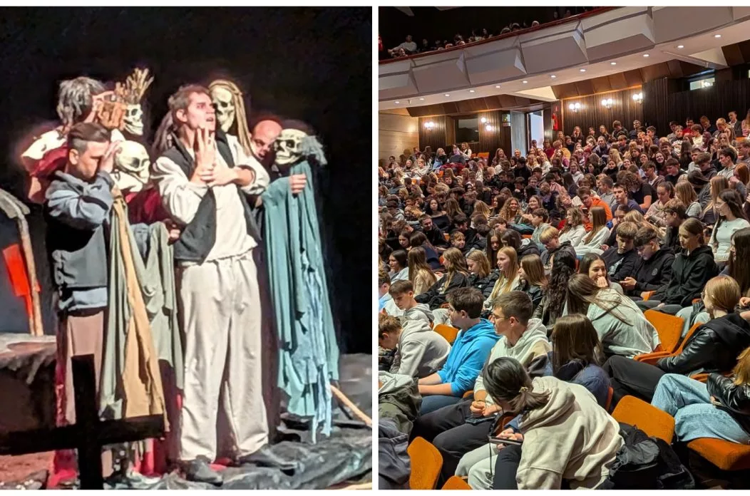 Gimnazija Josipa Slavenskog Čakovec – Učenici su doživjeli pravi kazališni spektakl posjetom Centru za kulturu Čakovec, gdje su gledali legendarnog Hamleta u izvedbi Kazališne družine Pinklec.