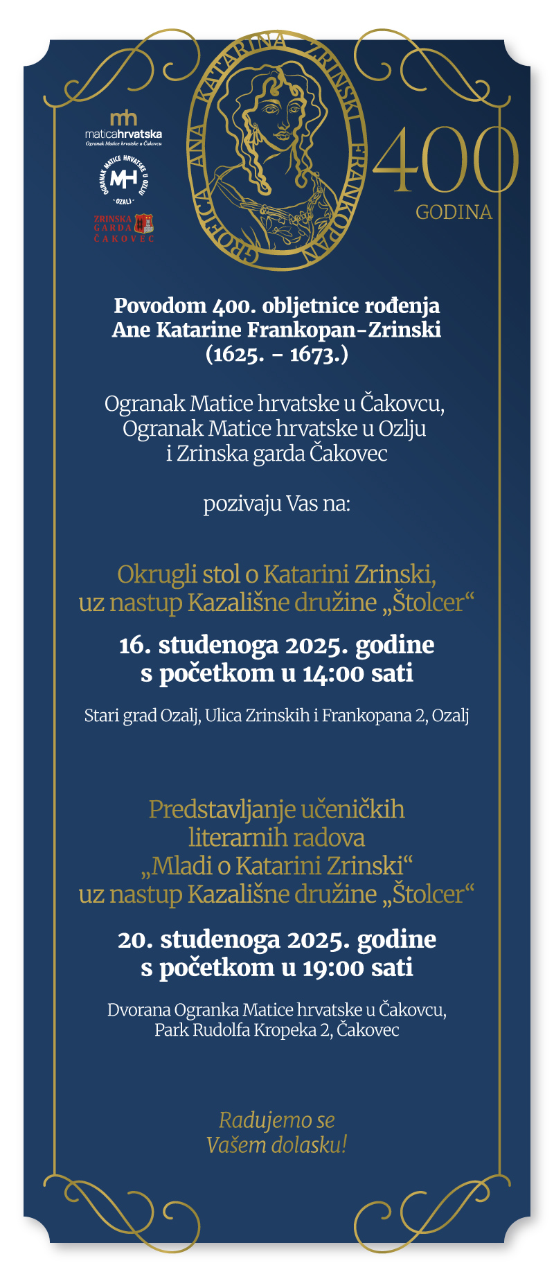Povodom 400. obljetnice rođenja slavne hrvatske plemkinje i ranonovovjekovne književnice Katarine Zrinski, Ogranak Matice hrvatske u Čakovcu u suradnji s Ogrankom Matice hrvatske u Ozlju i Zrinskom gardom Čakovec obilježit će ovaj važan jubilej u Ozlju i Čakovcu.