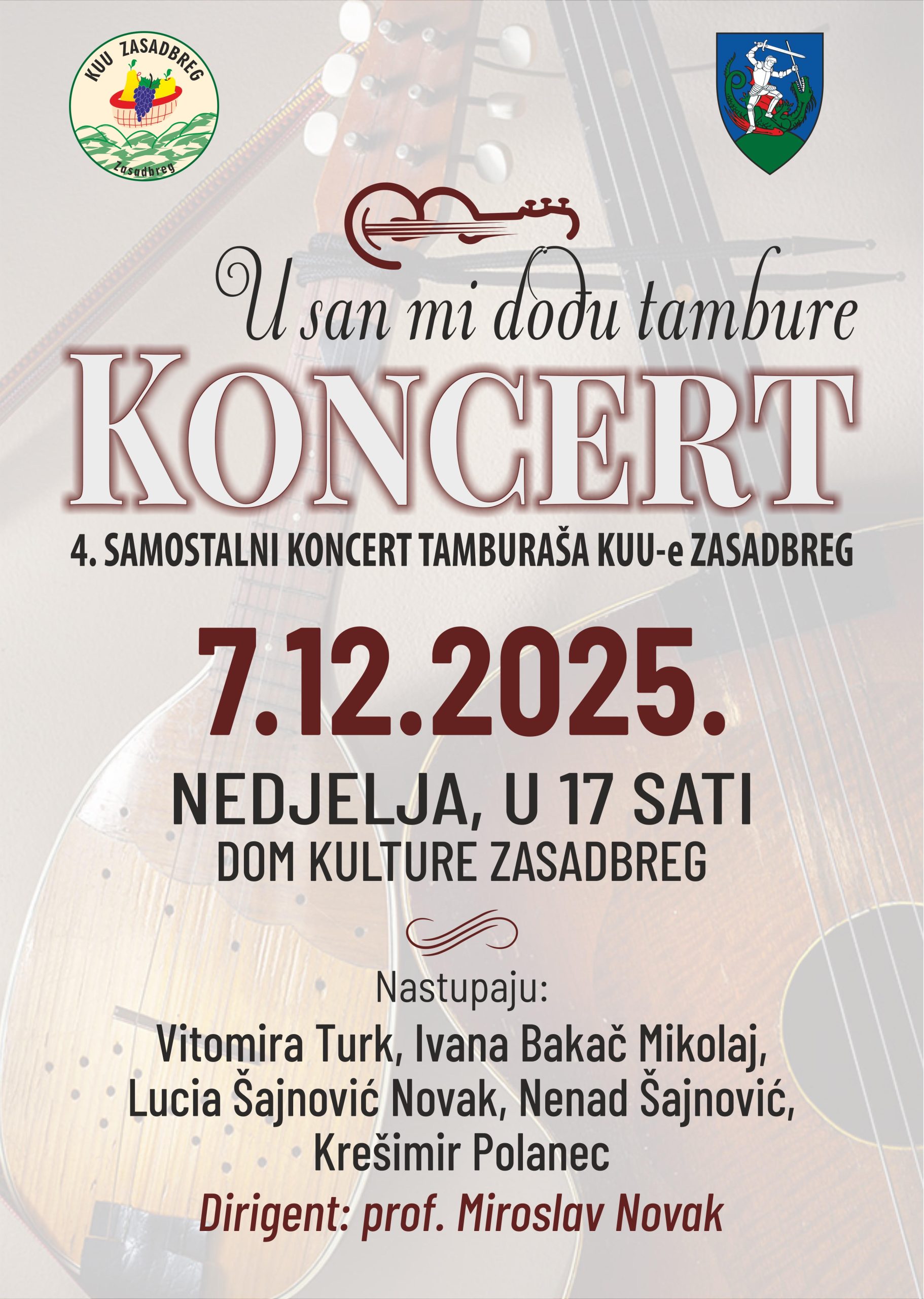Četvrti samostalni koncert tamburaša Kulturno-umjetničke udruge Zasadbreg održat će se u nedjelju, 7. prosinca 2025. godine, s početkom u 17 sati, u Domu kulture Zasadbreg