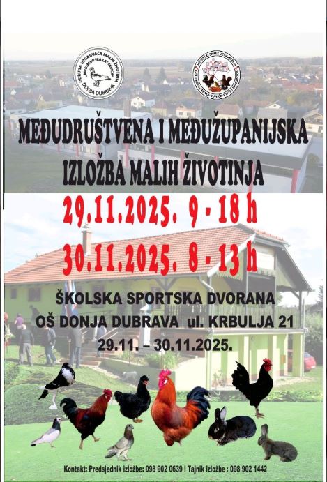 U Školskoj sportskoj dvorani OŠ Donja Dubrava, 29. i 30. studenoga 2025. održava se međudruštvena i međužupanijska izložba malih životinja. Posjetitelji će imati priliku vidjeti razne vrste životinja, uključujući ptice, zečeve i perad, te se upoznati s uzgojem i brigom za male životinje.
