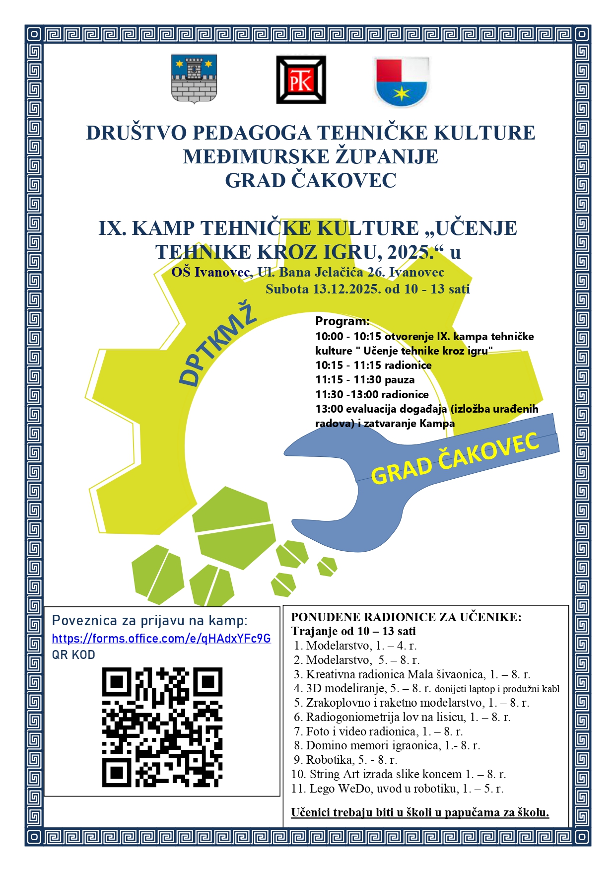 U sklopu programa IX. kampa tehničke kulture pripremljeno je 11 zanimljivih i raznolikih radionica, koje provodi Društvo pedagoga tehničke kulture Međimurske županije, uz podršku Grada Čakovca, Međimurske županije i OŠ Ivanovec.
