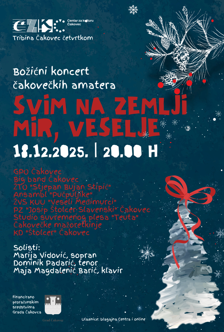 Tradicionalni božićni koncert čakovečkih amatera, pod nazivom ‘Svim na zemlji mir, veselje’, i ove će se godine održati u okviru posljednje Tribine Čakovec četvrtkom, donoseći publici bogat program prepun glazbenih i plesnih izvedbi