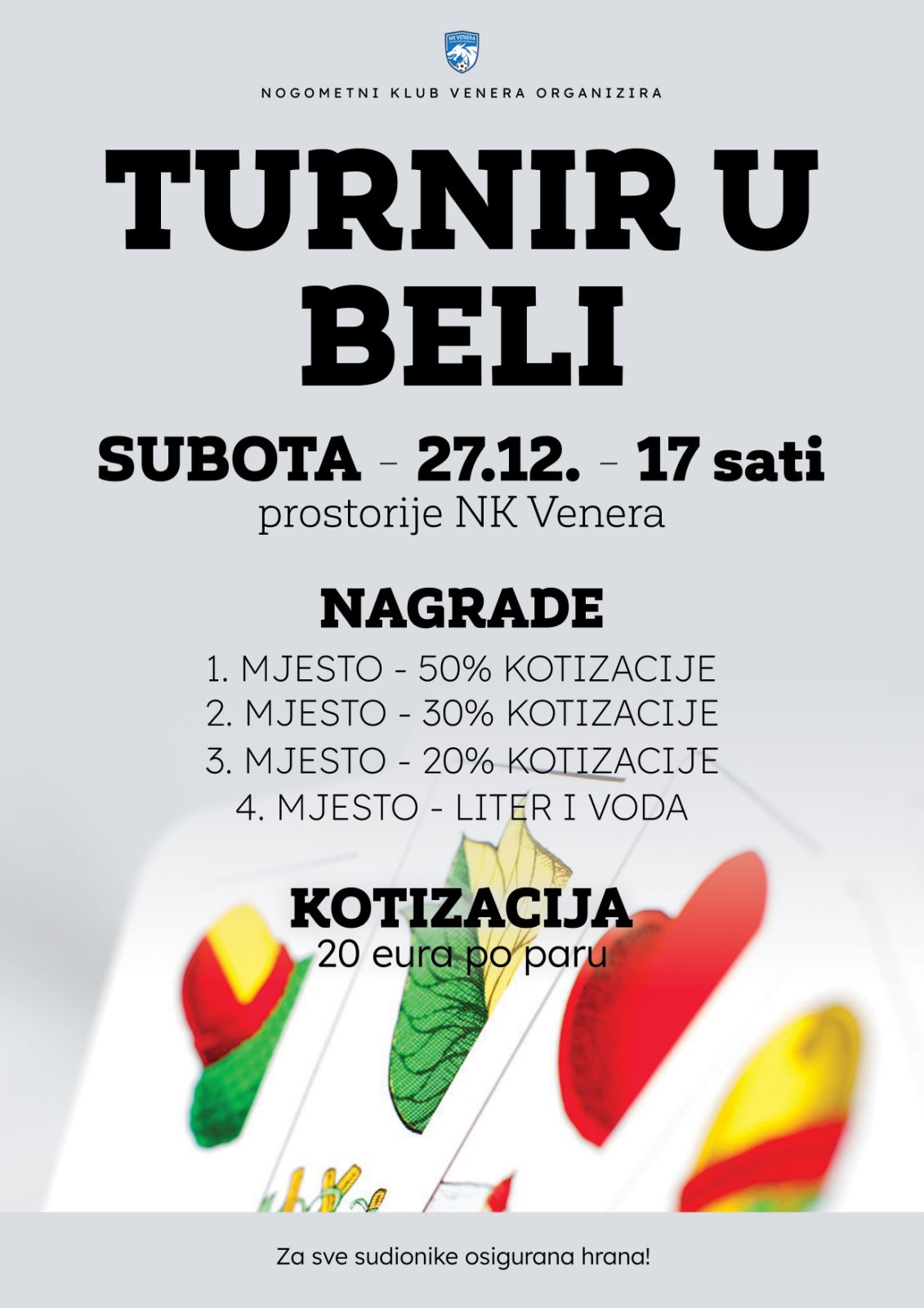 Turnir u beli ove subote održava se u Pleškovcu u prostorijama NK Venera. Prijave su otvorene, osigurane su nagrade i jelo za sve sudionike.