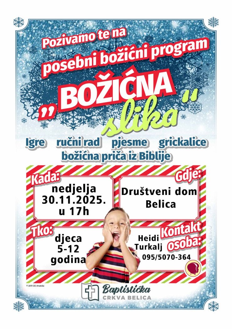Baptistička crkva Belica poziva djecu i žene na božićni program s igrama, pjesmama, ručnim radom i pričom iz Biblije u nedjelju 30.11.2025