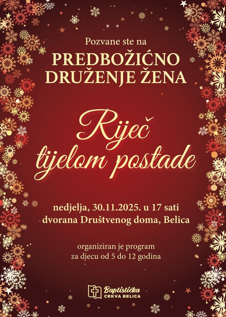 Istovremeno, žene su pozvane na predbožićno druženje s temom „Riječ tijelom postade“. Događaj će se održati u dvorani Društvenog doma Belica, a organizator je Baptistička crkva Belica.