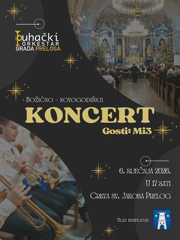 Božićno-novogodišnji koncert Puhačkog orkestra Grada Preloga uz etno grupu MI3 održava se 6. siječnja u Župnoj crkvi sv. Jakoba u Prelogu, ulaz besplatan
