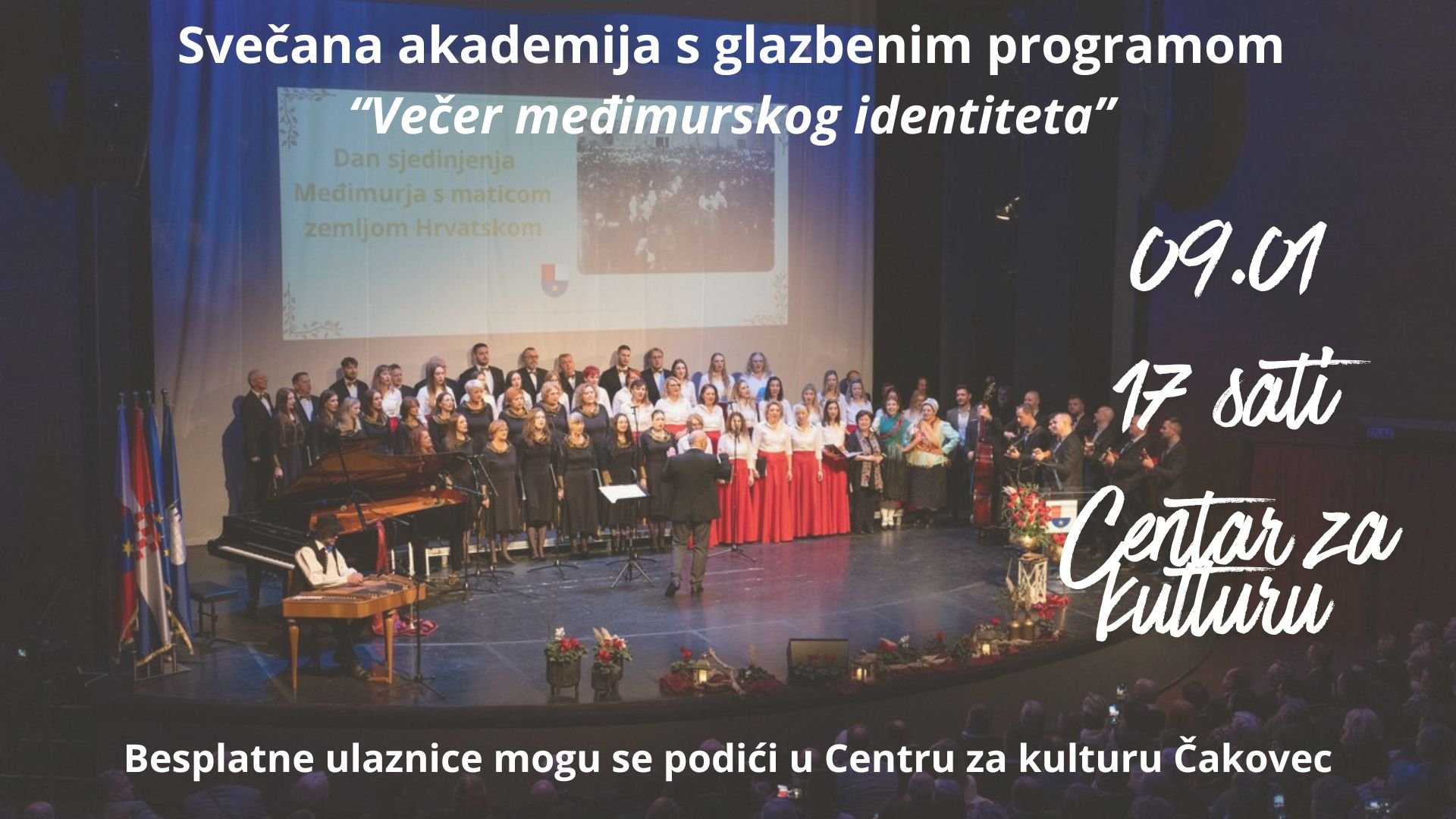 Svečana akademija s glazbenim programom održava se u čast Dana sjedinjenja Međimurja s maticom zemljom Hrvatskom, a nosi naziv „Večer međimurskog identiteta“. Upravo je 9. siječnja prije 107 godina na Franjevačkom trgu u Čakovcu održana Velika narodna skupština na kojoj se okupilo više od 10.000 Međimurki i Međimuraca.