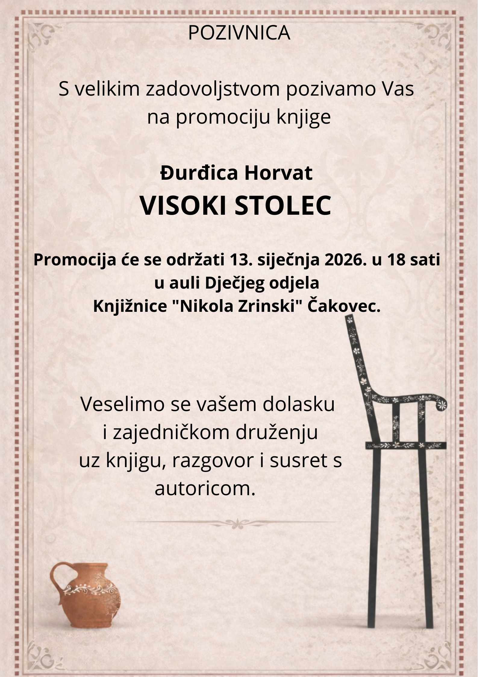 U Knjižnica Nikola Zrinski Čakovec u utorak, 13. siječnja 2026. godine, s početkom u 18 sati, održat će se promocija knjige „Visoki stolec“, autorice Đurđice Horvat. Promocija će se održati u auli Dječjeg odjela knjižnice, a uz autoricu o knjizi će govoriti urednica Sandra Mikac.
