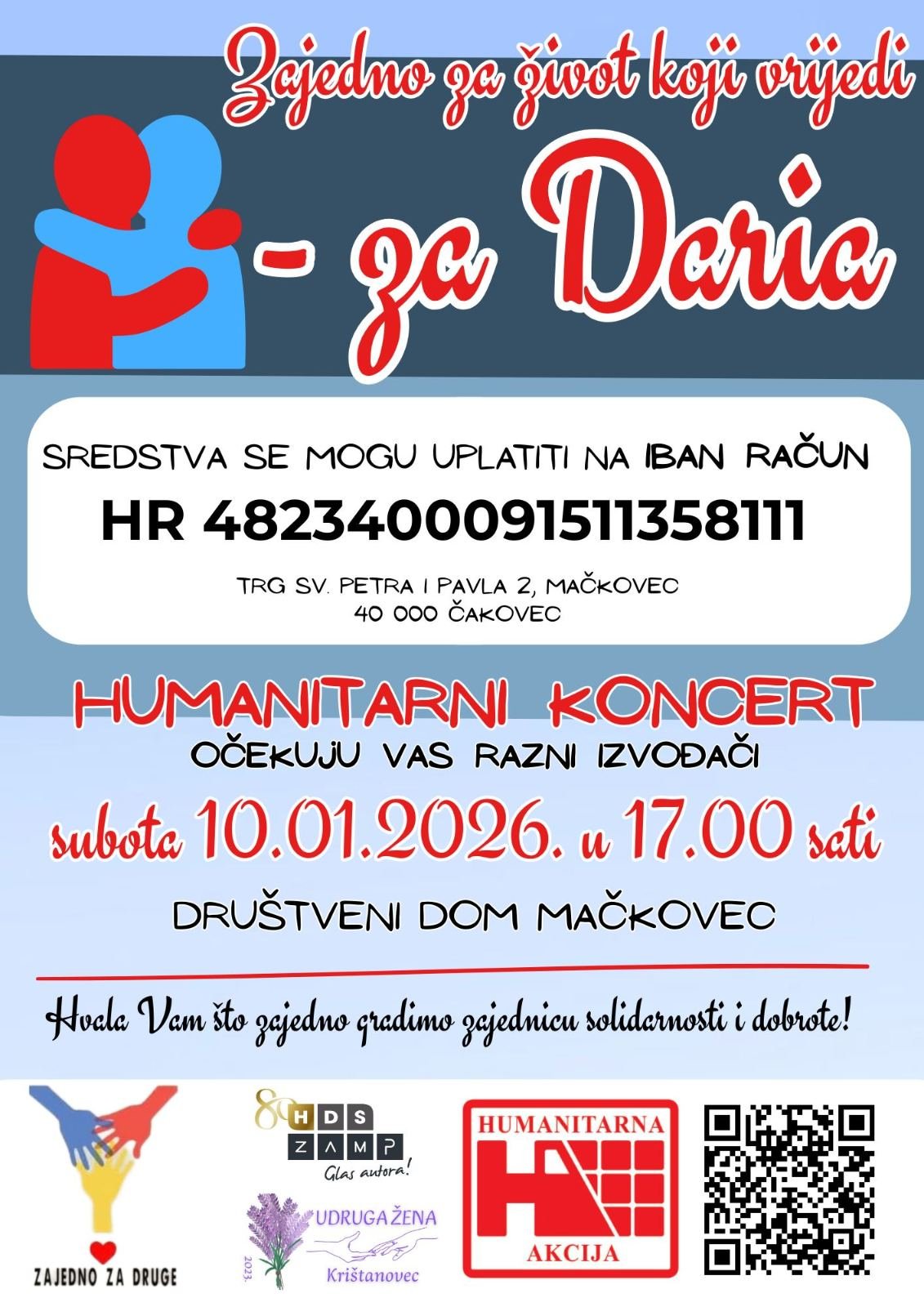 U Mačkovcu će se u subotu, 10. siječnja, s početkom u 17 sati, u Društvenom domu Mačkovec održati humanitarni koncert i akcija pod nazivom „Zajedno za život koji vrijedi – za Daria“, s ciljem prikupljanja novčanih sredstava za pomoć obitelji Sabadi.