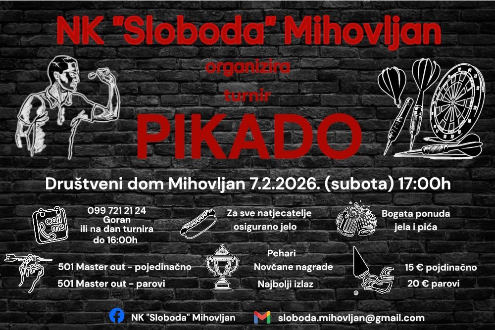 NK „Sloboda“ Mihovljan organizira pikado turnir 7. veljače u Društvenom domu Mihovljan s pojedinačnom i parovnom disciplinom, peharima, novčanim nagradama i hranom za sve sudionike
