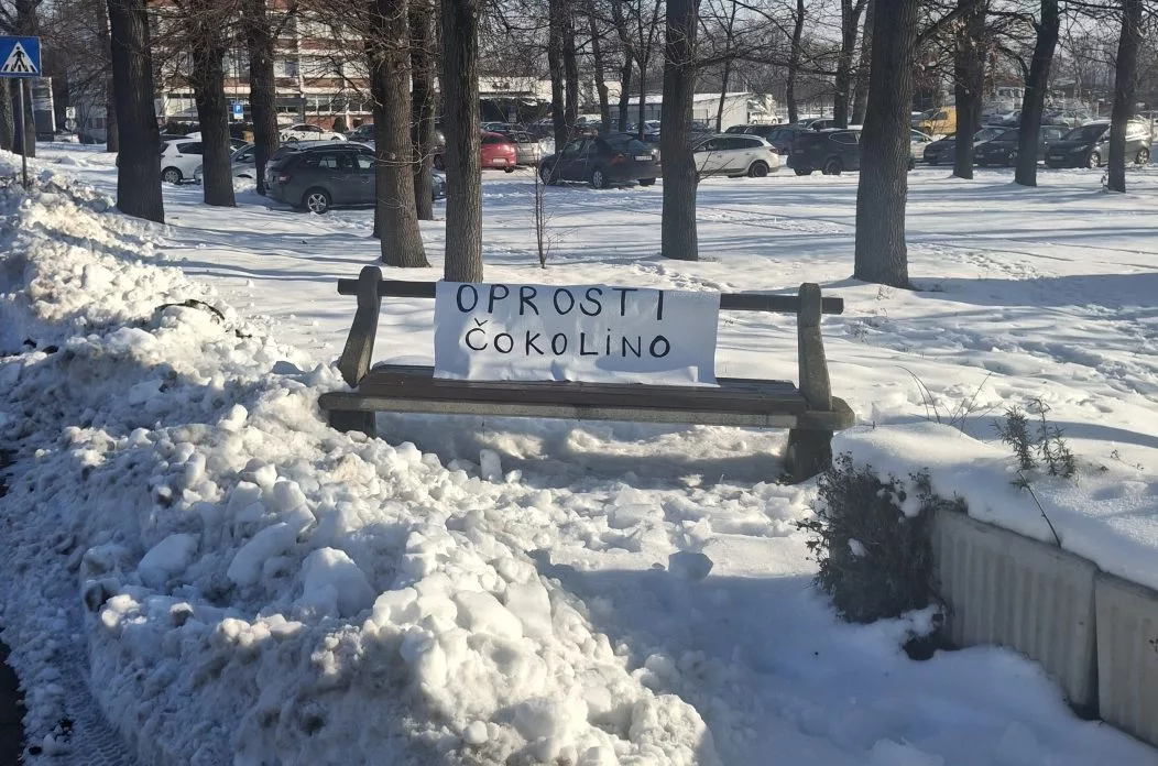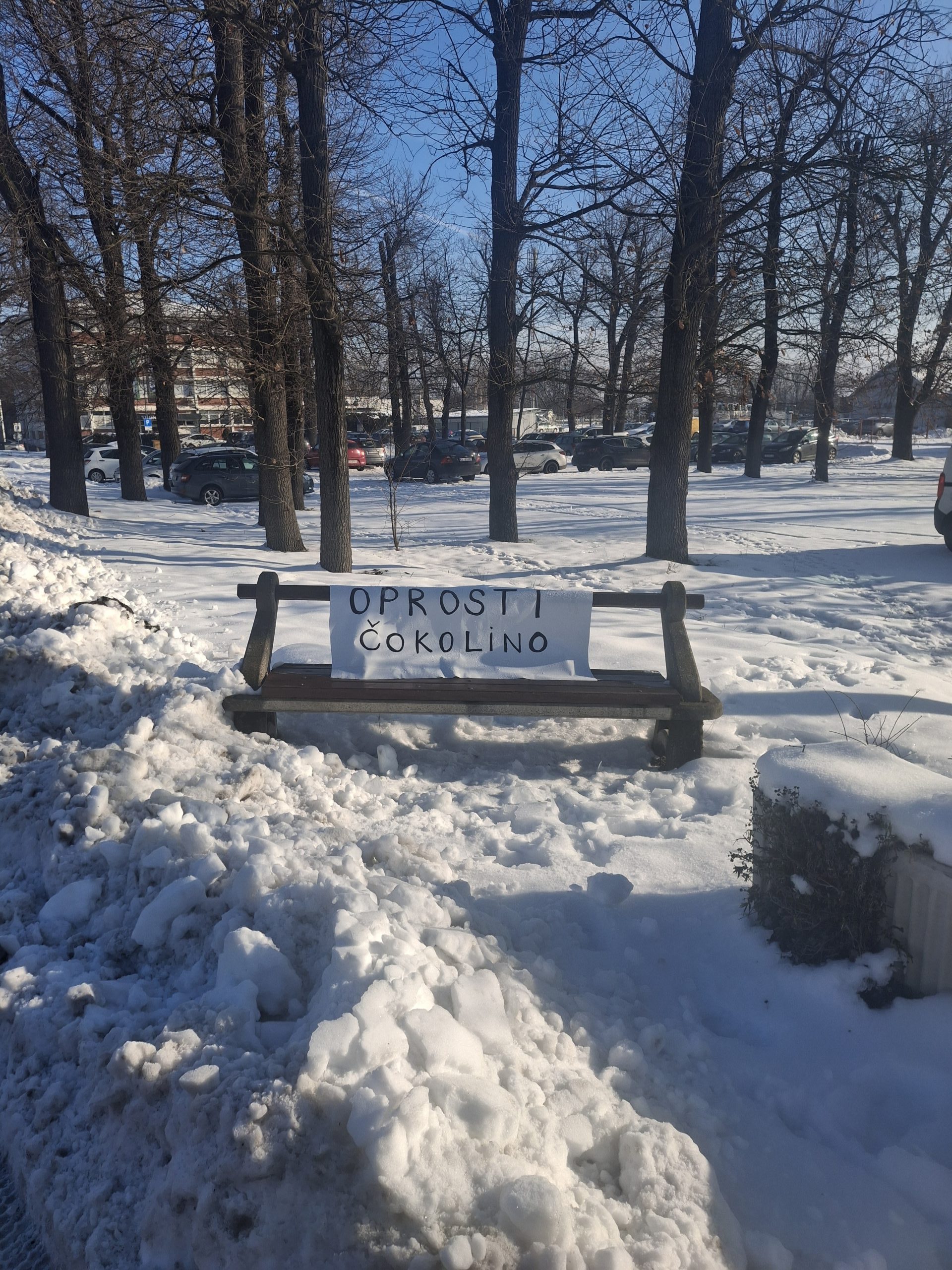 Čitatelj nam je poslao fotografiju klupice s porukom „Oprosti Čokolino“, koja je mnogima izmamila osmijeh u zimskom danu.