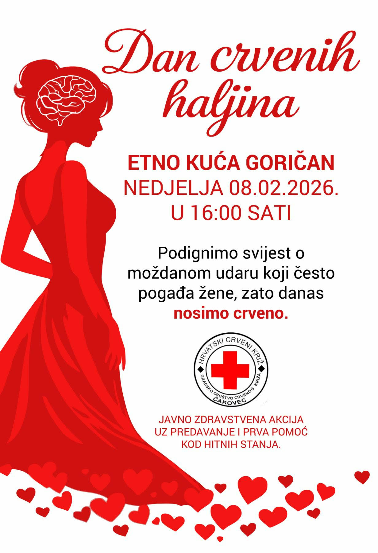 Dan crvenih haljina bit će obilježen u nedjelju, 8. veljače 2026. godine, u Etno kući Goričan, s početkom u 16 sati, javnozdravstvenom akcijom usmjerenom na podizanje svijesti o moždanom udaru, bolesti koja sve češće pogađa žene.
