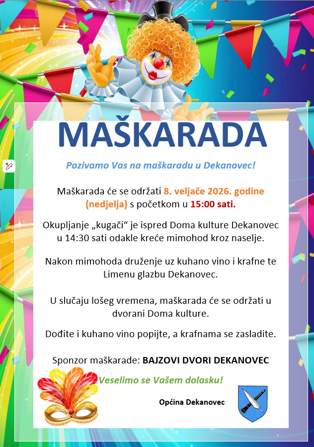 Općina Dekanovec poziva sve mještane i posjetitelje na maškaradu koja će se održati u nedjelju, 8. veljače 2026. godine, s početkom u 15:00 sati.