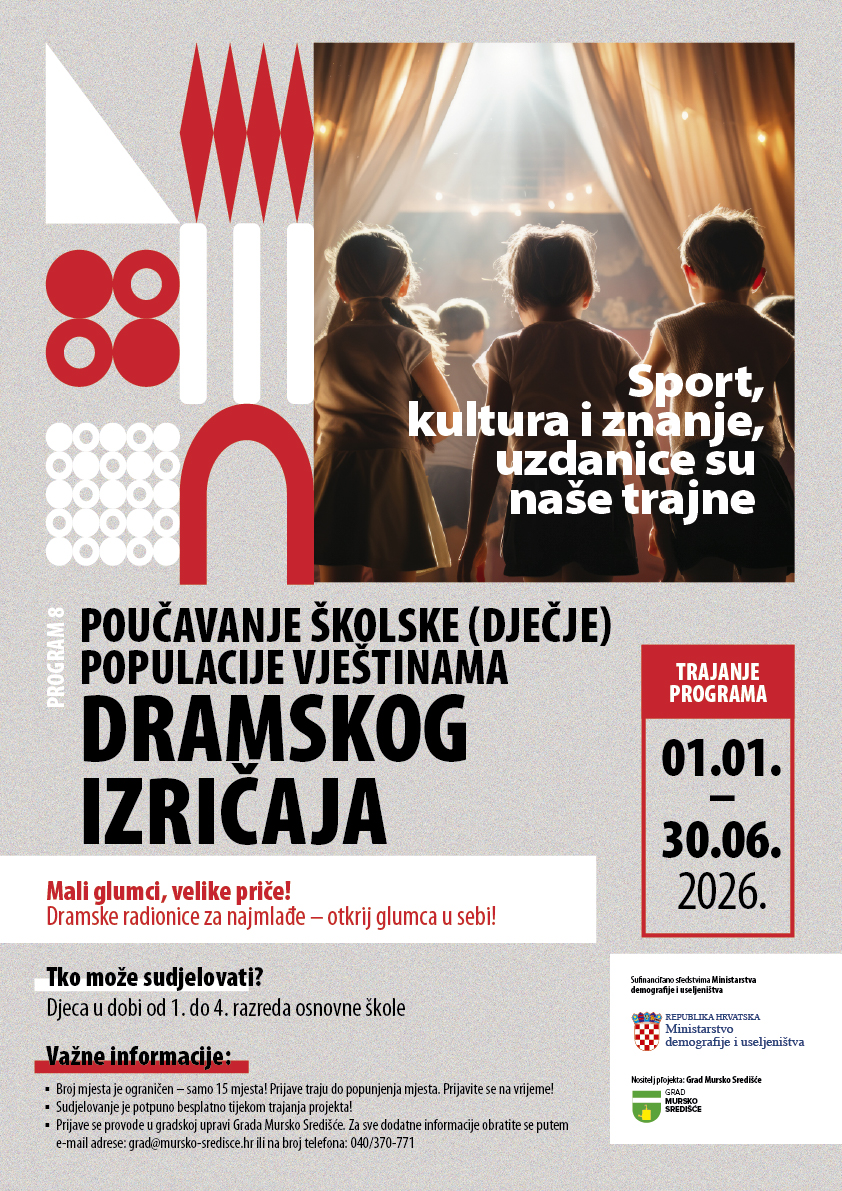 U sadržaju projekta SPORT, KULTURA I ZNANJE, UZDANICE SU NAŠE TRAJNE Grada Mursko Središće uz sufinanciranje sredstvima Ministarstva demografije i useljeništva, u kontekstu Programa 8, jedna od važnih odrednica je „Poučavanje školske (dječje) populacije vještinama dramskog izričaja”.