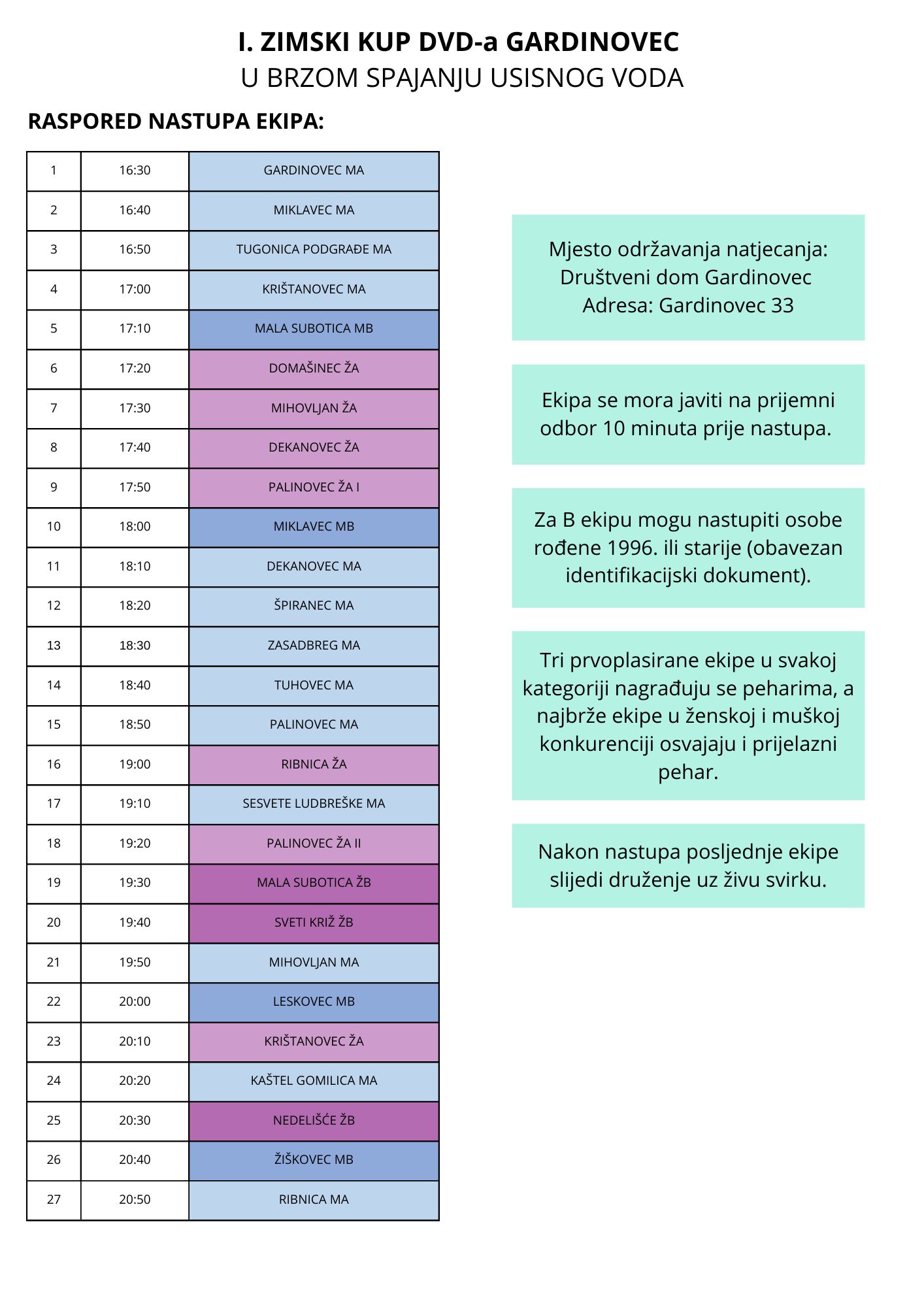 Prema objavljenom rasporedu, prva na start izlazi ekipa Gardinovec MA u 16.30 sati, a potom slijede Miklavec MA, Tugonica Podgrađe MA, Krištanovec MA i Mala Subotica MB.