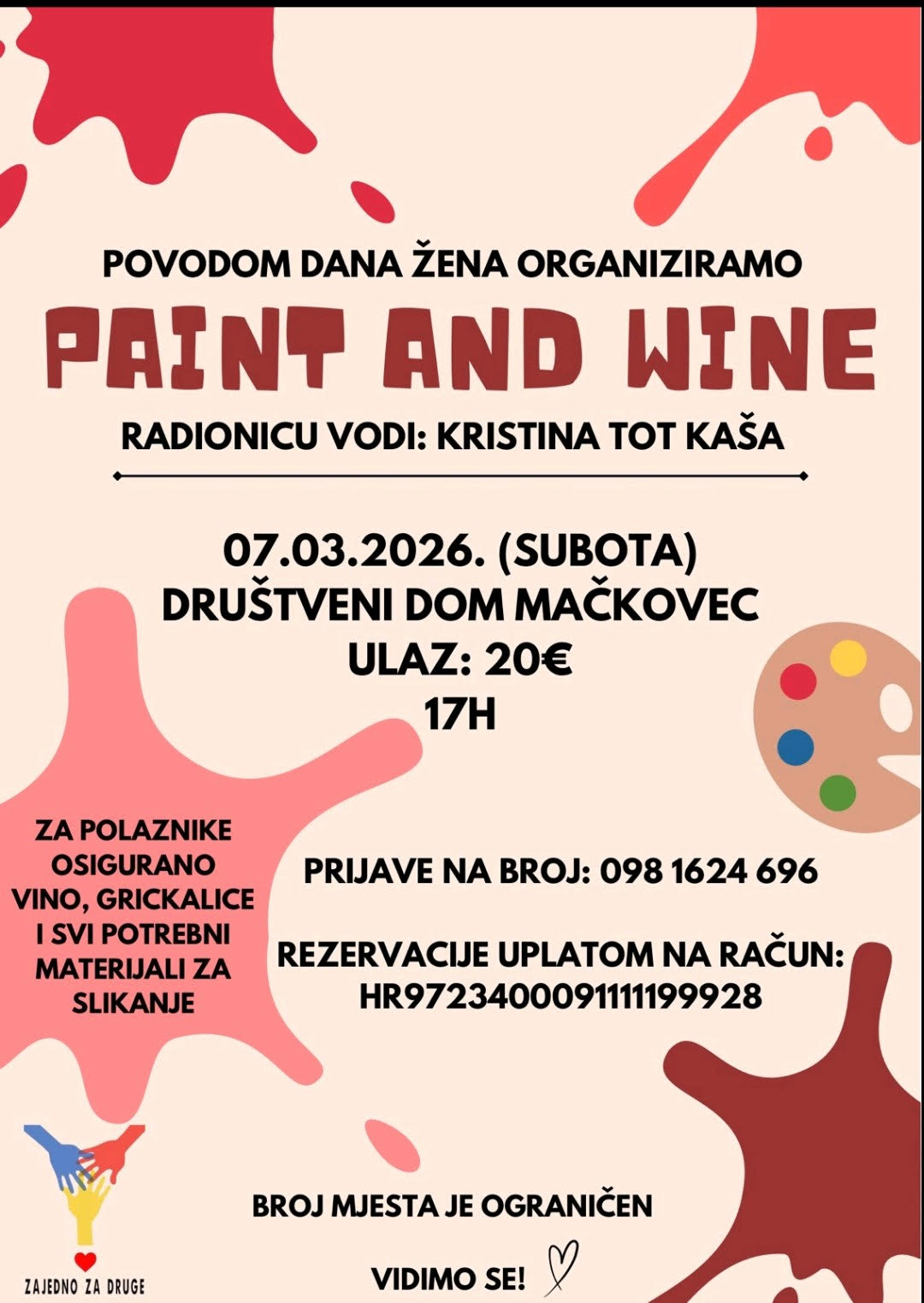 U subotu 7. ožujka u Društvenom domu u Mačkovcu s početkom u 17 sati održat će se vođena kreativna radionica pod nazivom Paint & Wine.