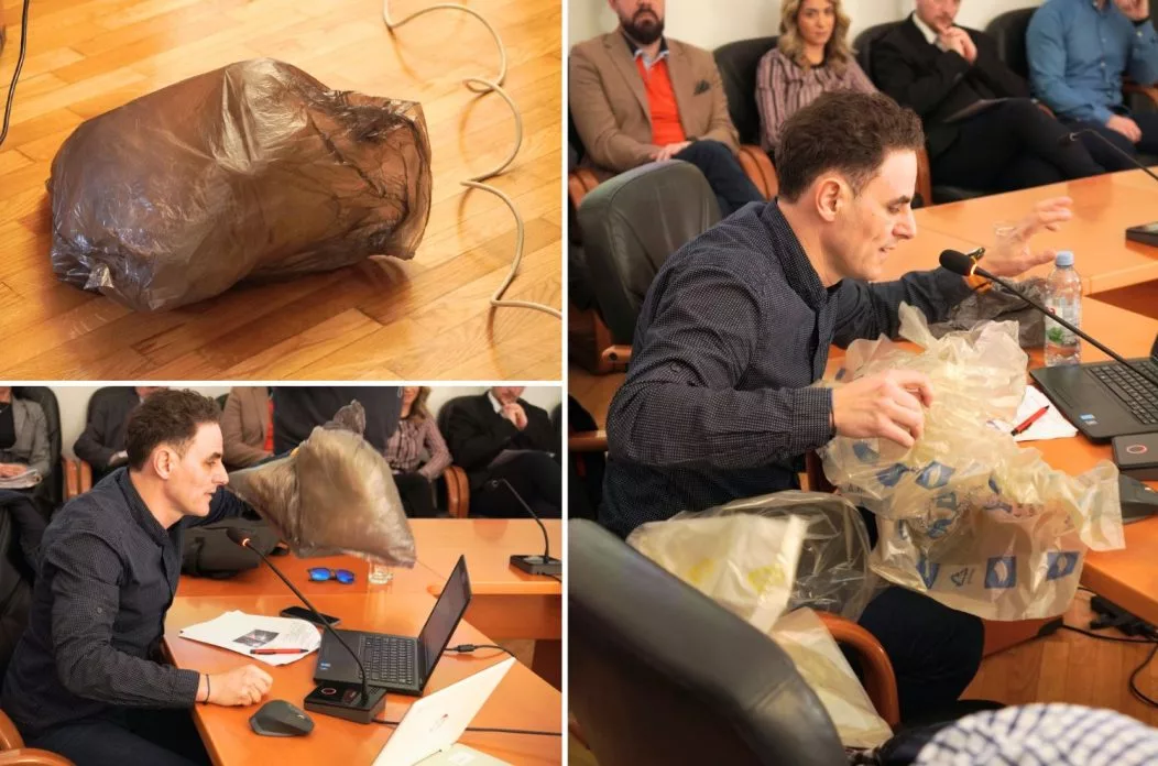 Tijekom tog govora, odnosno postavljanja pitanja, demonstrativno je ubacio plastičnu bocu u jednu od vreća za recikliranje, potom tu i još jednu praznu vreću stavio u treću vreću i bacio na pod, na sredinu gradske vijećnice!