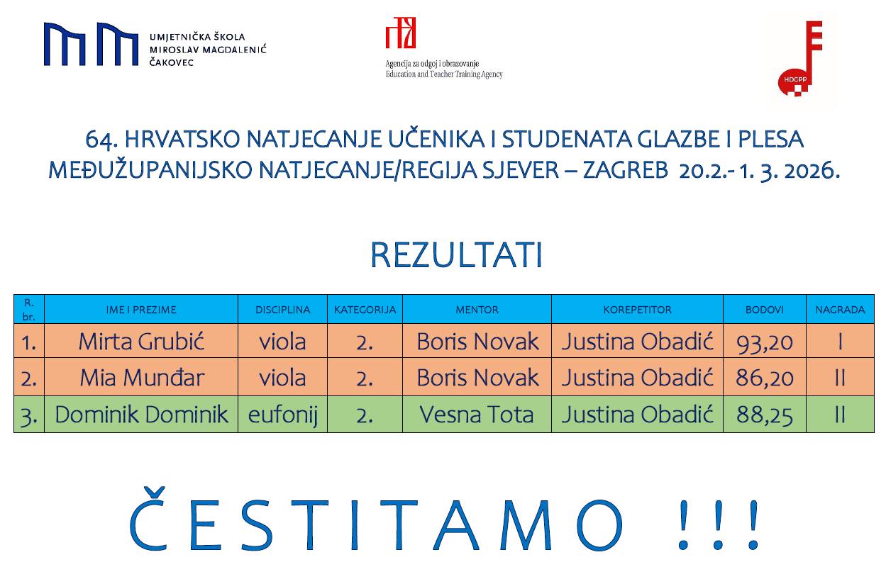 Prema objavljenim rezultatima međužupanijskog natjecanja/regije Sjever – Zagreb, održanog od 20. veljače do 1. ožujka 2026., na 64. hrvatskom natjecanju učenika i studenata glazbe i plesa, Mirta Grubić (viola, 2. kategorija) pod mentorstvom Borisa Novaka i uz korepetitoricu Justinu Obadić osvojila je 93,20 bodova i prvu nagradu. Mia Mundar (viola, 2. kategorija), također učenica mentora Borisa Novaka uz korepetitoricu Justinu Obadić, osvojila je 86,20 bodova i drugu nagradu, dok je Dominik Dominik (eufonij, 2. kategorija) pod mentorstvom Vesne Tote i uz korepetitoricu Justinu Obadić osvojio 88,25 bodova i drugu nagradu.