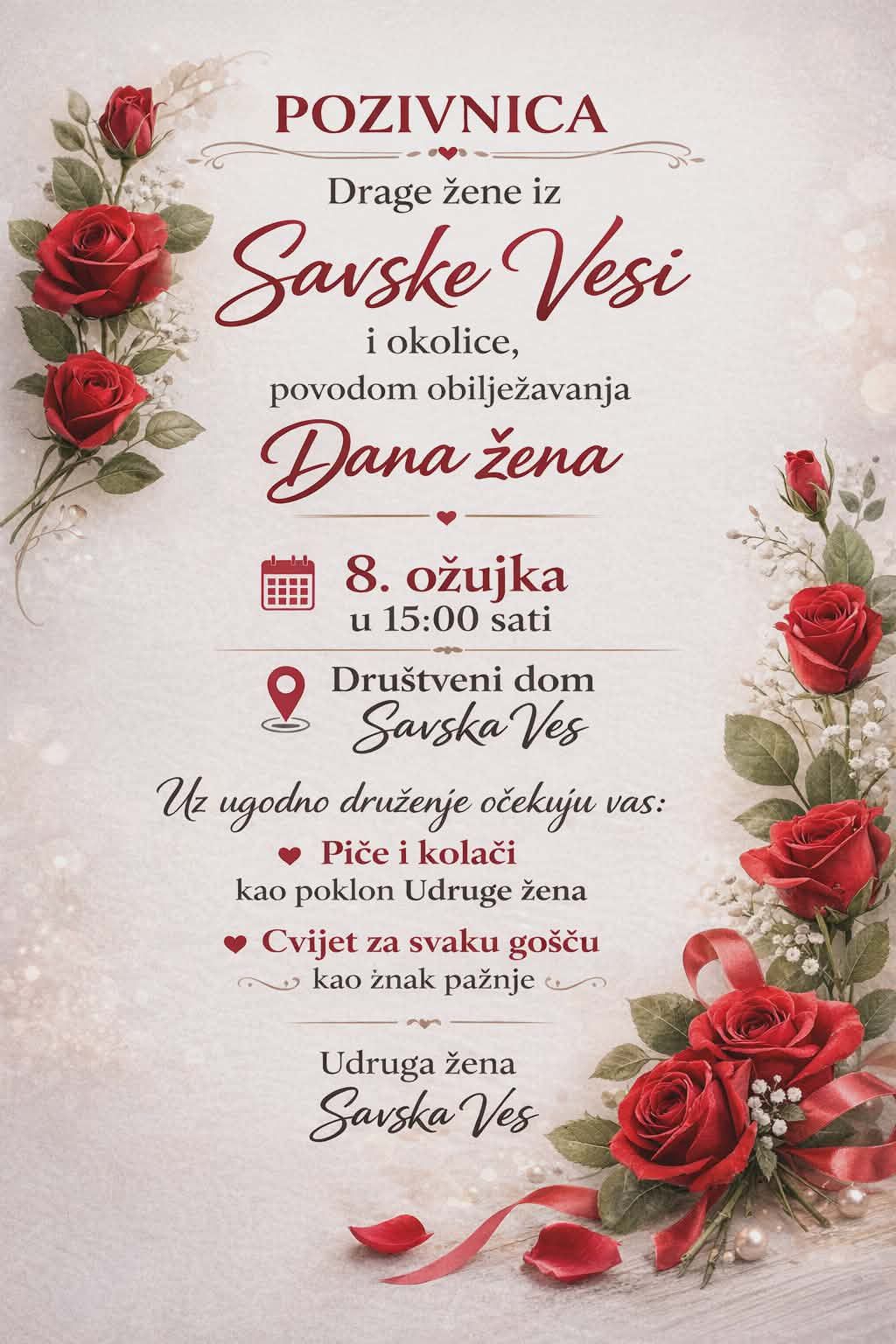 Udruga žena Savska Ves poziva sve mještanke i gošće na prigodno druženje uz kavu kolače i cvijeće povodom Dana žena u društvenom domu