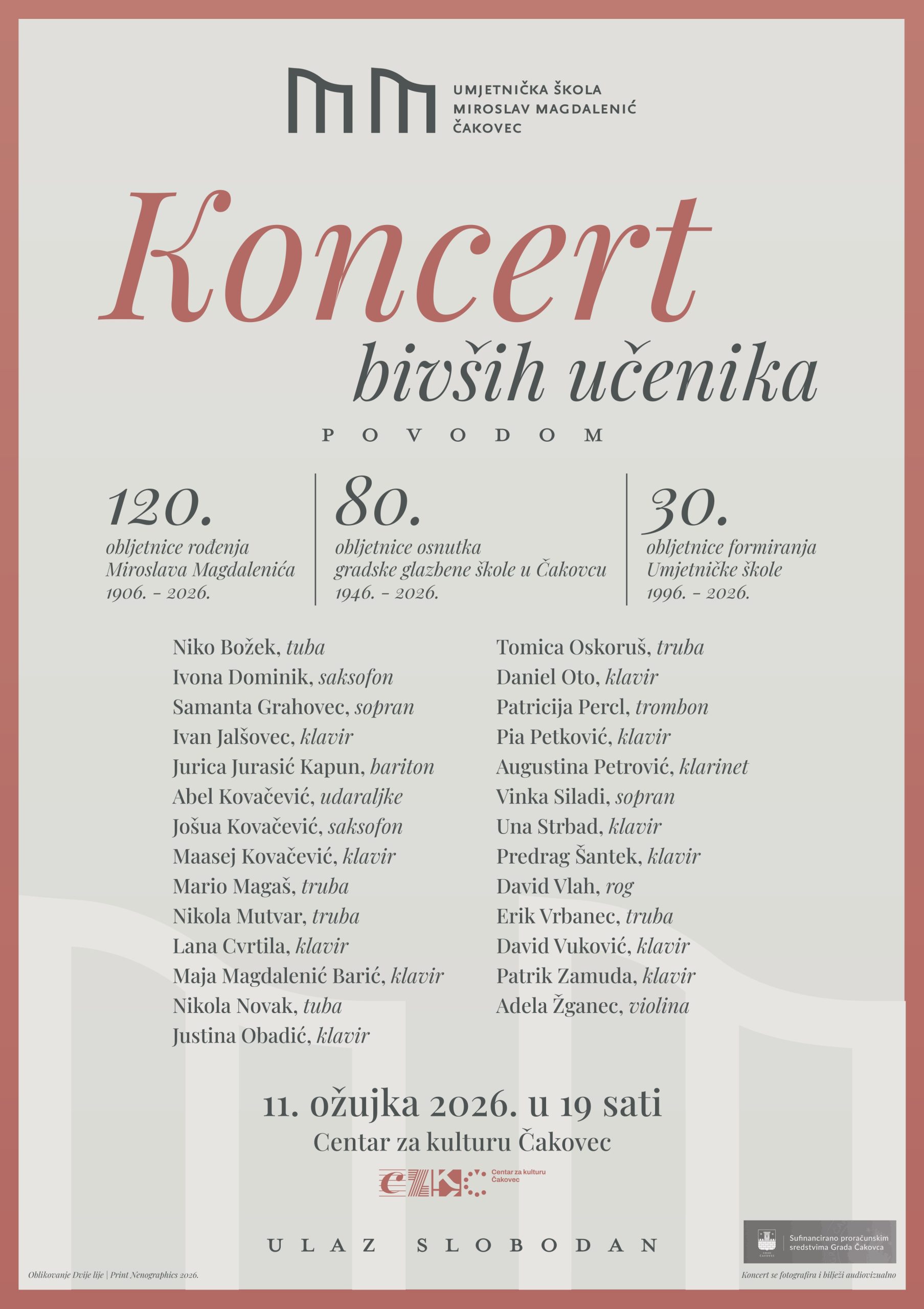 Koncert se organizira povodom triju značajnih obljetnica: 120. obljetnice rođenja Miroslava Magdalenića (1906. – 2026.), 80. obljetnice osnutka gradske glazbene škole u Čakovcu (1946. – 2026.) te 30. obljetnice formiranja Umjetničke škole (1996. – 2026.).