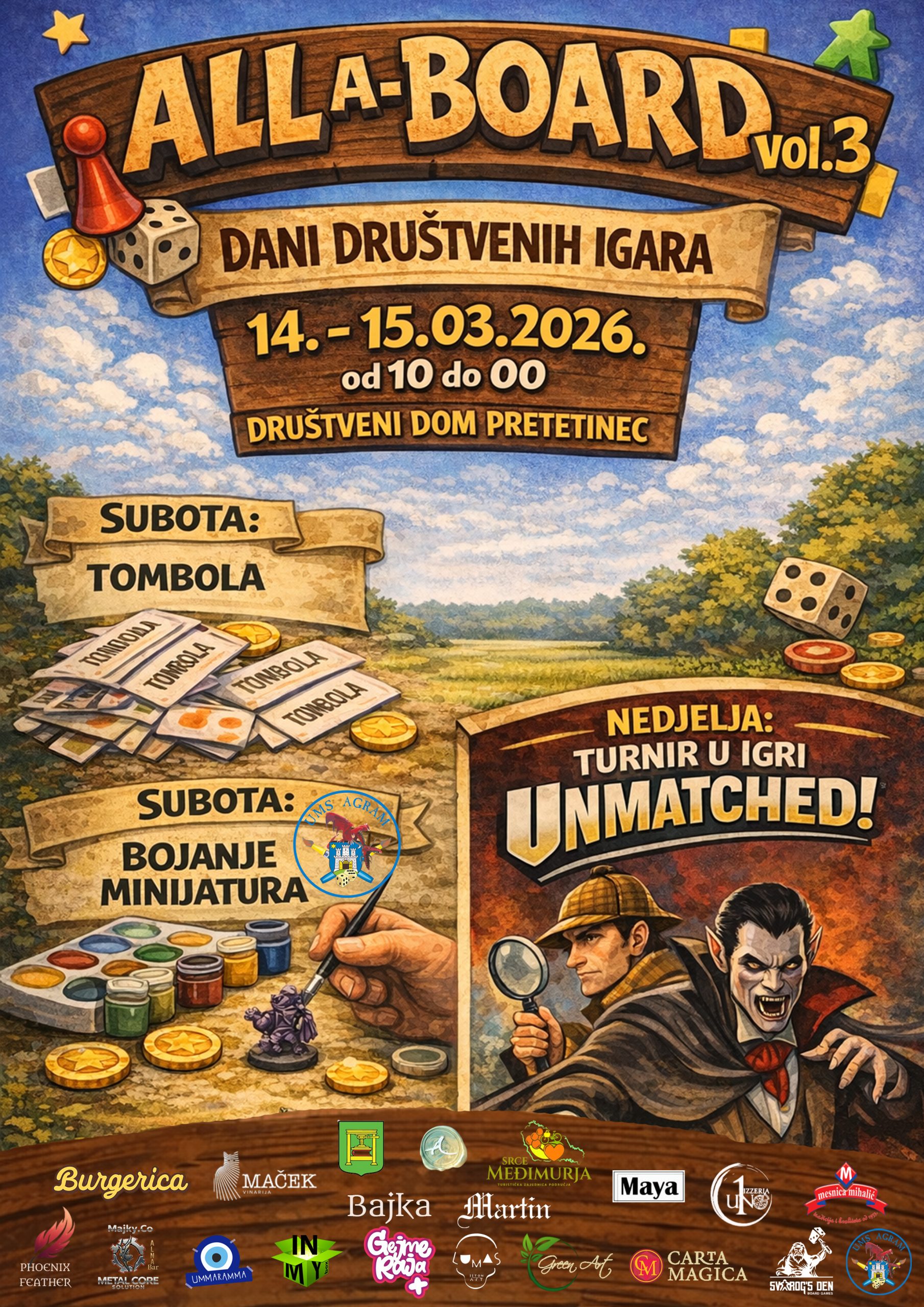 Manifestacija All a-Board – Dani društvenih igara vraća se po treći put, no ovaj put lokacija je Društveni dom Pretetinec, 14. i 15. ožujka 2026. godine, u organizaciji Udruge Artisto, entuzijasta koji već nekoliko godina predano razvijaju umjetnost, kulturu i svijet modernih društvenih igara u Međimurju. Program će se odvijati od 10 do 24 sata, a posjetitelje očekuje vikend ispunjen druženjem, strateškim nadmudrivanjem i kreativnim radionicama.