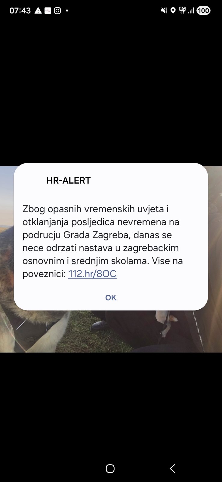 Zbog loših vremenskih uvjeta u Zagrebu je otkazana i nastava u svim školama, a građani su upozoreni na opasnost od pada stabala i oštećenja infrastrukture.