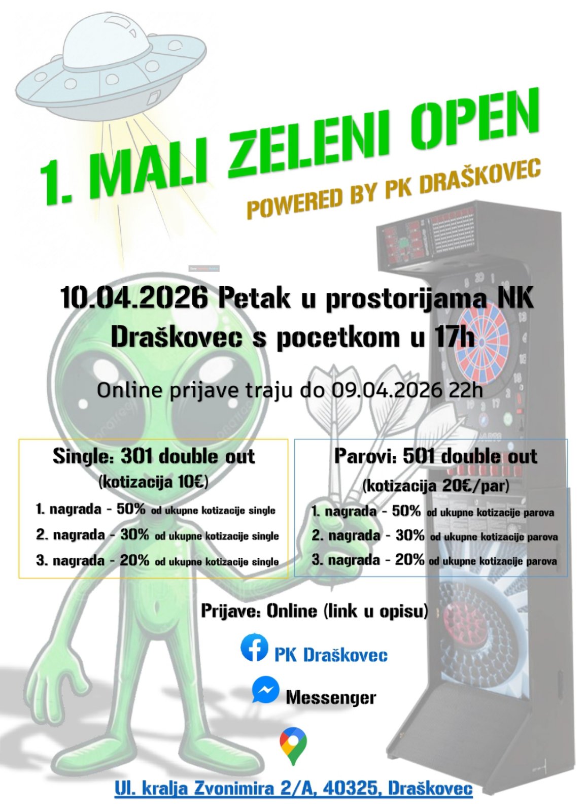 Turnir pod nazivom 1. Mali Zeleni Open održat će se u petak, 10. travnja 2026., s početkom u 17 sati u prostorijama NK Draškovec na adresi Ul. kralja Zvonimira 2/A.