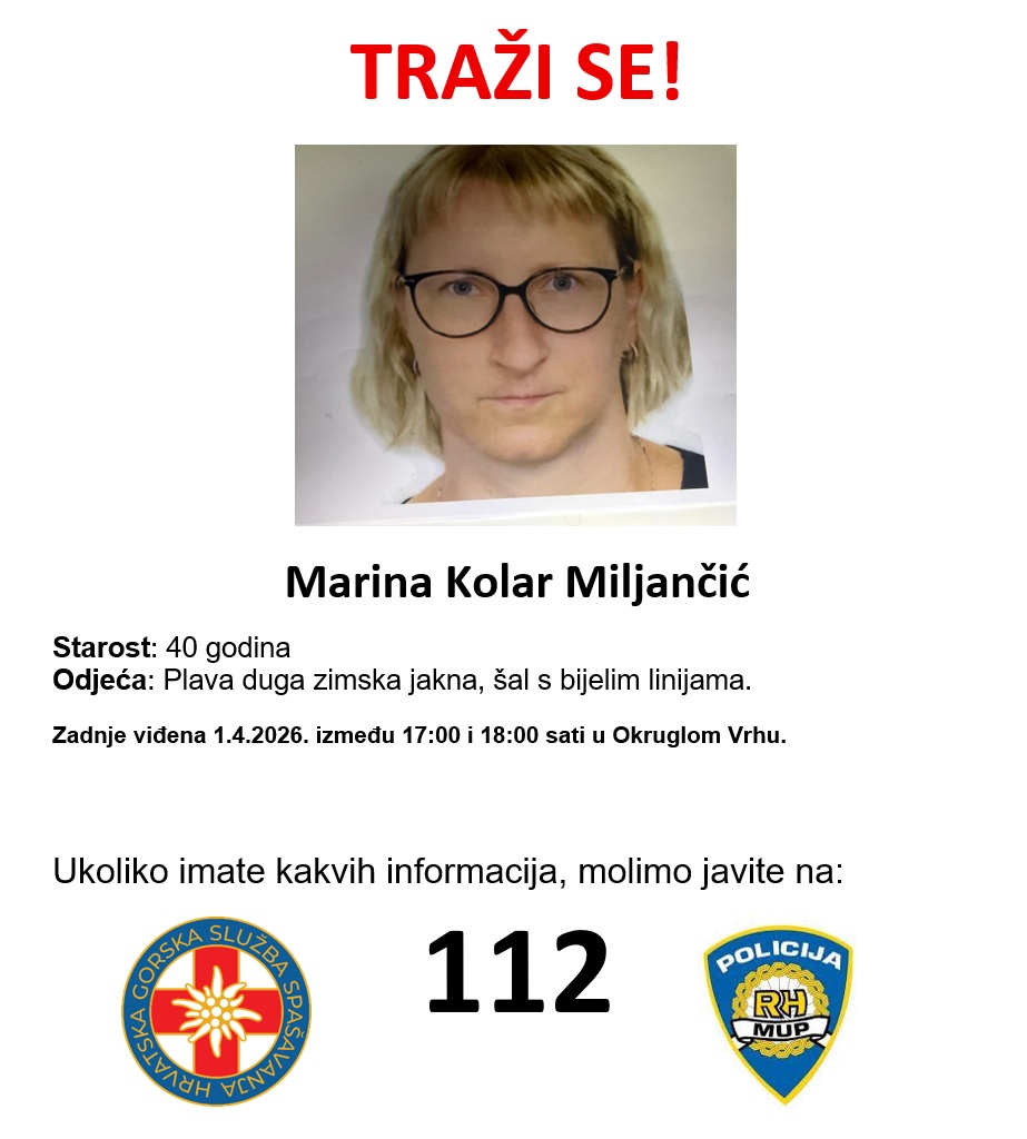 Nestala osoba Marina Kolar Miljančić predmet je intenzivne potrage nakon što je posljednji put viđena u srijedu, 1. travnja 2026. godine u Okruglom Vrhu.