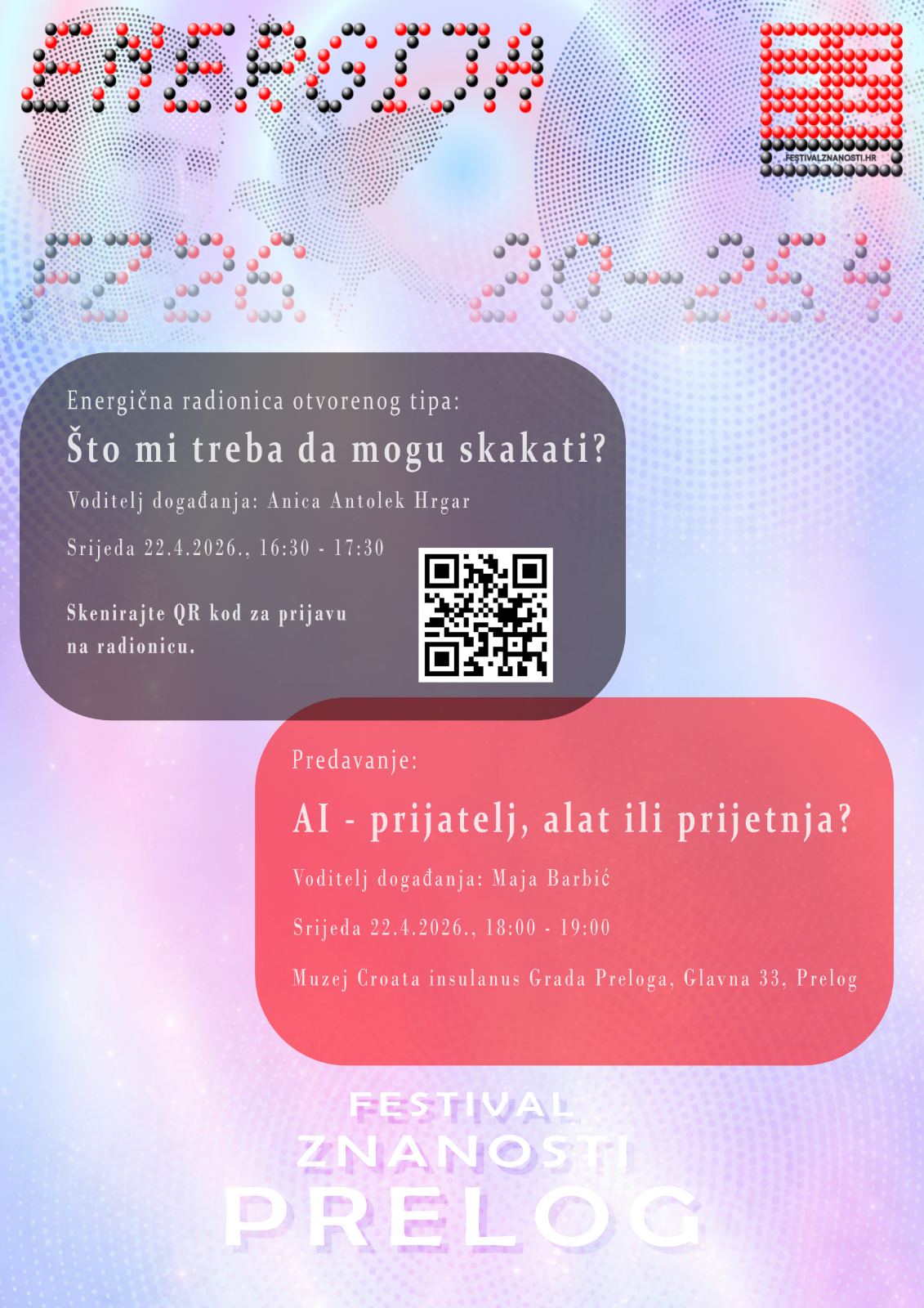 U Prelogu će Festival znanosti posjetiti Osnovnu školu Prelog, Osnovnu školu Draškovec te dječje vrtiće Fijolica i Vesela loptica, a u srijedu 22. travnja, dvije će se zanimljive radionice održati u prostoru Multimedijalne dvorane Muzeja Croata insulanus Grada Prelog. Od 16,30 radionicu pod nazivom “Što mi treba da mogu skakati” vodit će Anica Antolek Hrgar, a od 18 sati, predavanje pod nazivom “AI – prijatelj, alat ili prijetnja”, održat će Maja Barbić.