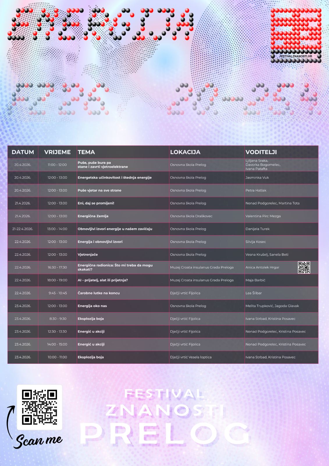 Cjelokupan popis ovogodišnjih aktivnosti na razini države objavljen je na webu: https://festivalznanosti.hr/2026/prelog/ ili na Facebook stranici Festival znanosti Prelog