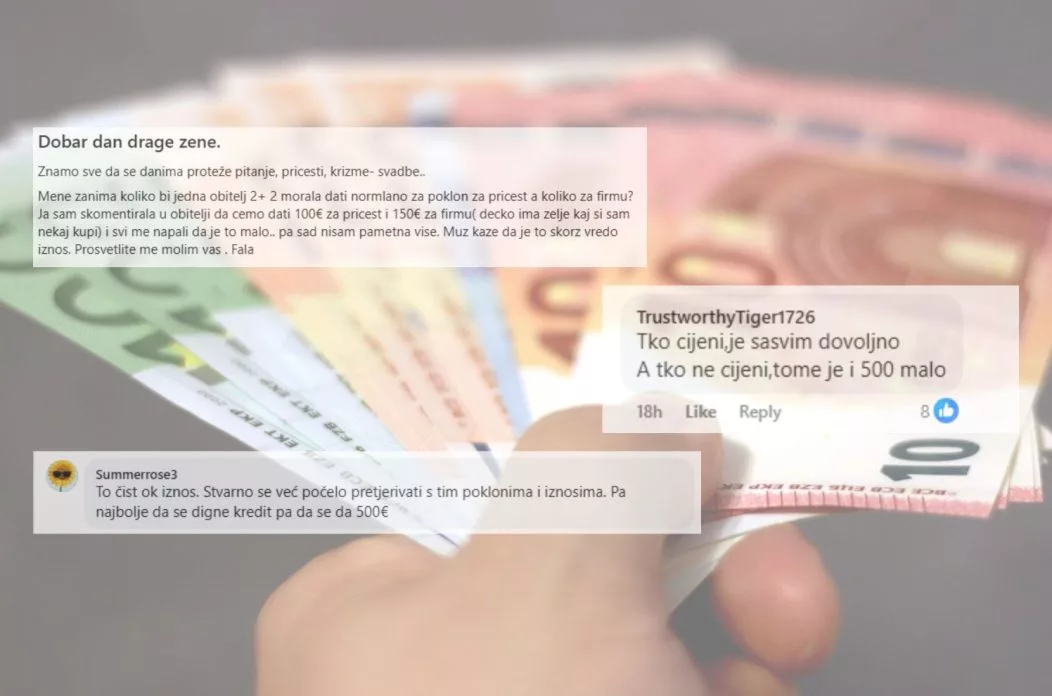 Članice Facebook grupe “Međimurske mame i trudnice” susrele su se s istim pitanjem. Jedna je članica rekla da bi za pričest kao obitelj dali 100 eura, a za krizmu 150 eura jer si krizmanik ima želju nešto sam kupiti. Kako kaže, neki su je napali da je to malo pa je pomoć potražila u navedenoj grupi.