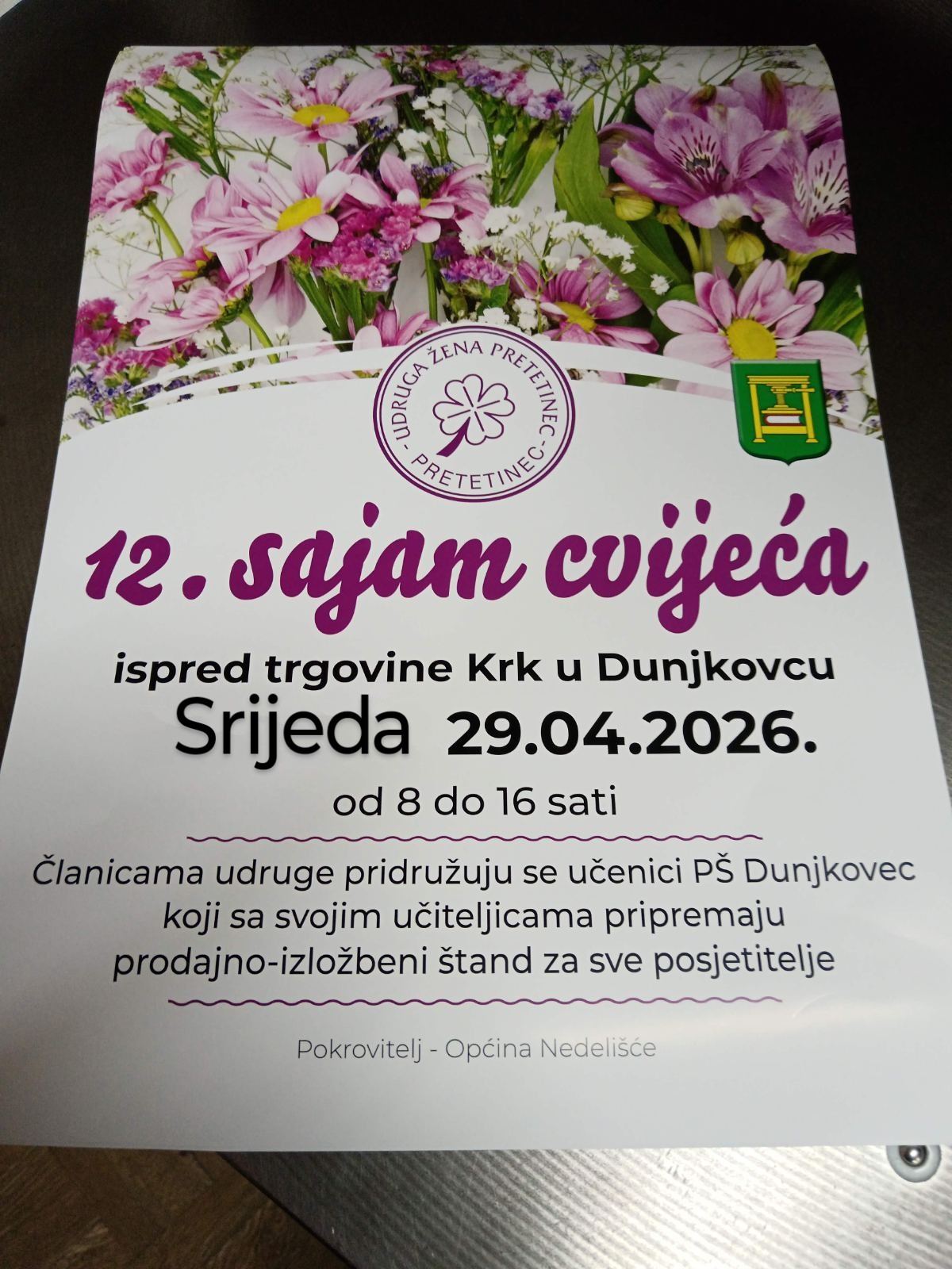 Udruga žena Pretetinec s veseljem poziva sve građane i posjetitelje na 12. Sajam cvijeća, koji će se održati u srijedu, 29. travnja 2026. godine, od 8:00 do 16:00 sati ispred trgovine Krk u Dunjkovcu.