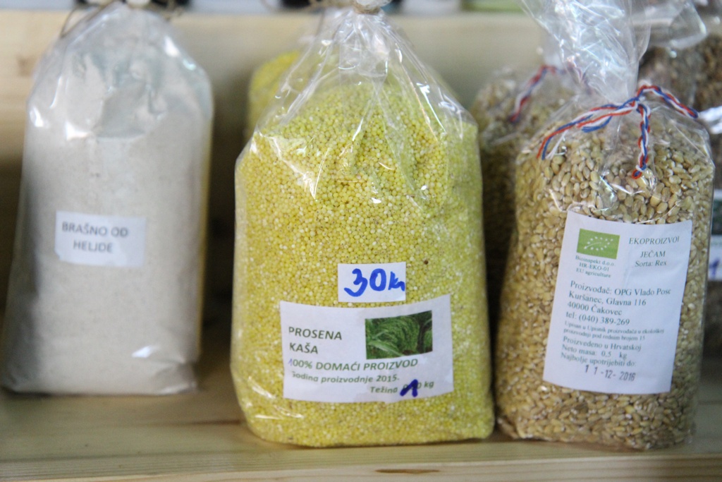 Ovog tjedna i mi smo sa osmijehom krenuli na naš plac, i izdvojili slijedeće namirnice eko tržnice (hajdinsku i prosenu kašu, međimurska golica, međimursko koščično (bučino), laneno i konopljino ulje, brašno od bučinih koštica.