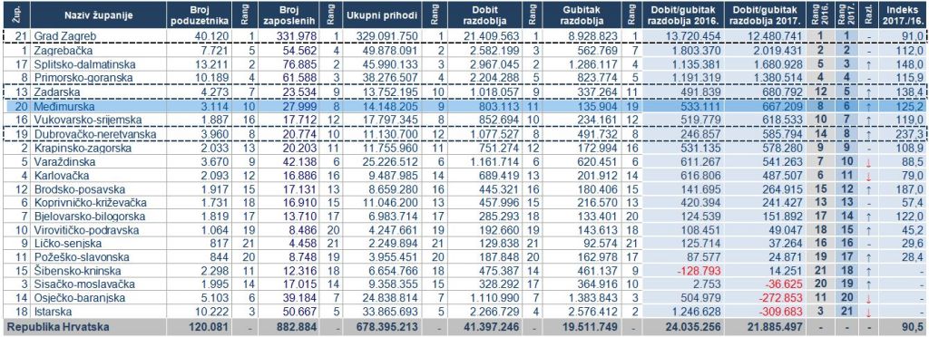 Vrijedi istaknuti da su od 21,9 milijardi kuna neto dobiti, 80,2 % ostvarili poduzetnici u četiri županije: Gradu Zagrebu, Zagrebačkoj, Splitsko-dalmatinskoj i Primorsko-goranskoj županiji, u kojima sjedište ima 71 241 poduzetnika (59,3 %). Poduzetnici čije je sjedište u županiji Grad Zagreb prvorangirani su po svim prezentiranim kriterijima.