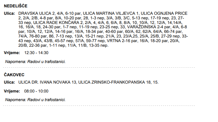 ELEKTRA ČAKOVEC Nedelišće, Čakovec i još pet naselja u utorak ostaju bez struje
