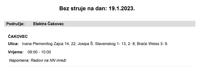 ELEKTRA ČAKOVEC U četvrtak nekoliko ulica u Čakovcu bez struje