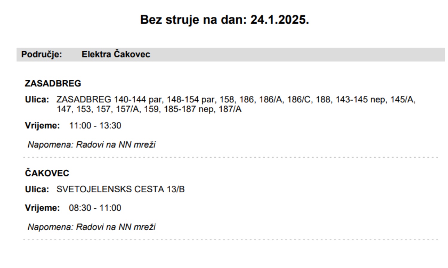 Zbog najavljenih radova na održavanju niskonaponske električne mreže, stanovnici pojedinih dijelova Čakovca i Zasadbrega će se suočiti s privremenim prekidima u opskrbi električnom energijom. Iz poduzeća Elektra Čakovec ističu kako su radovi nužni za osiguravanje stabilnosti i kvalitete opskrbe električnom energijom u budućnosti.
