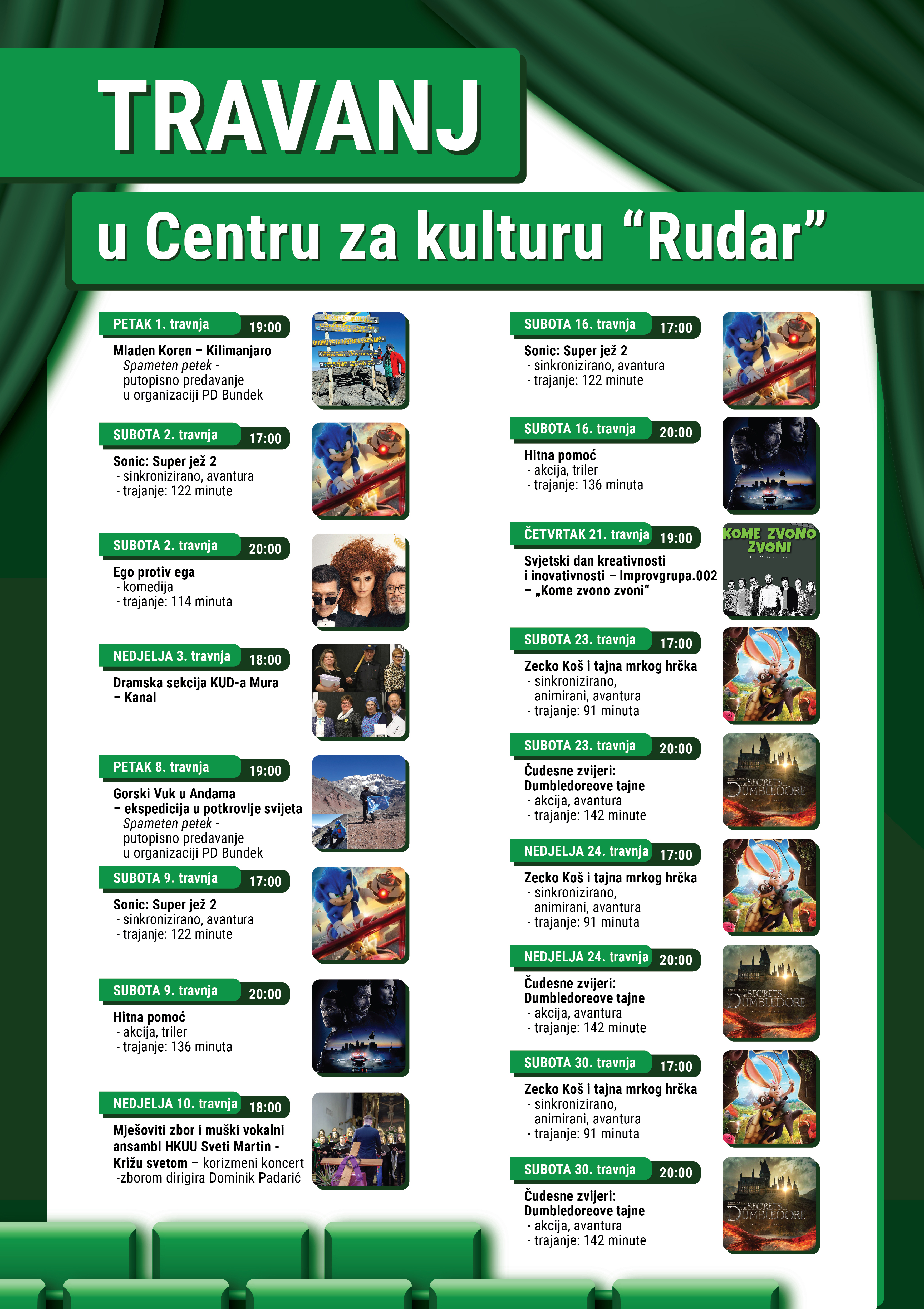 Pošto je blagdansko vrijeme, većina će filmskih hitova biti subotama, dok nedjeljama imamo kazališnu predstavu domaćeg KUD-a Mura i koncert susjednog HKUU Sveti Martin na Muri. Ulaz na predstavu i koncert je besplatan. Na svjetski dan kreativnosti i inovativnosti organizirat ćemo i nešto novo za našu publiku u izvedbi Improvgrupe 002 iz Čakovca koja okuplja dobro nam poznate međimurske glumce. Ulaznice za filmske projekcije su po popularnoj cijeni od 25,00, odnosno 15,00 kuna i kupuju se na blagajni prije početka filma. Travanj donosi i nastavak predavanja u organizaciji PD Bundek, čime i završava ovogodišnji ciklus, koji će se nastaviti u svibnju u organizaciji Centra za istraživanje Međimurja.
