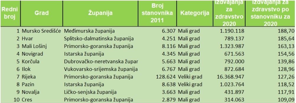 To je prvo mjesto još izraženije ukoliko se sagledaju udvajanja u odnosu na kompletne rashode u toj godini. Naime, kompletni rashodi Grada Mursko Središće u 2020. godini iznosili su 23.420.673,00 kuna, pri čemu su odvajanja za zdravstvo čak 5,08 % proračuna. Na 2. mjestu našao se Grad Orahovica s 2,96% izdvajanja za zdravstvo.