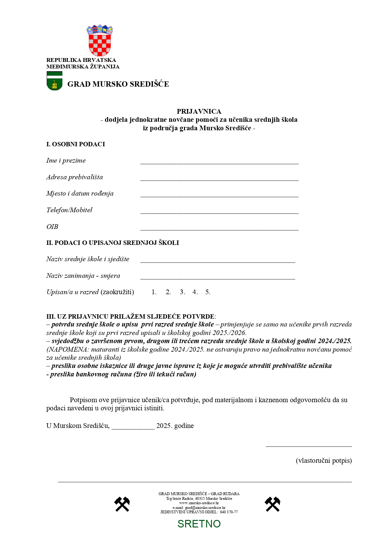 Grad Mursko Središće u svrhu dodjele jednokratne novčane pomoći za potrebe školovanja prikuplja popis učenika srednjih škola s područja grada Mursko Središće. Visina jednokratne novčane pomoći iznosi 70,00 eura.
