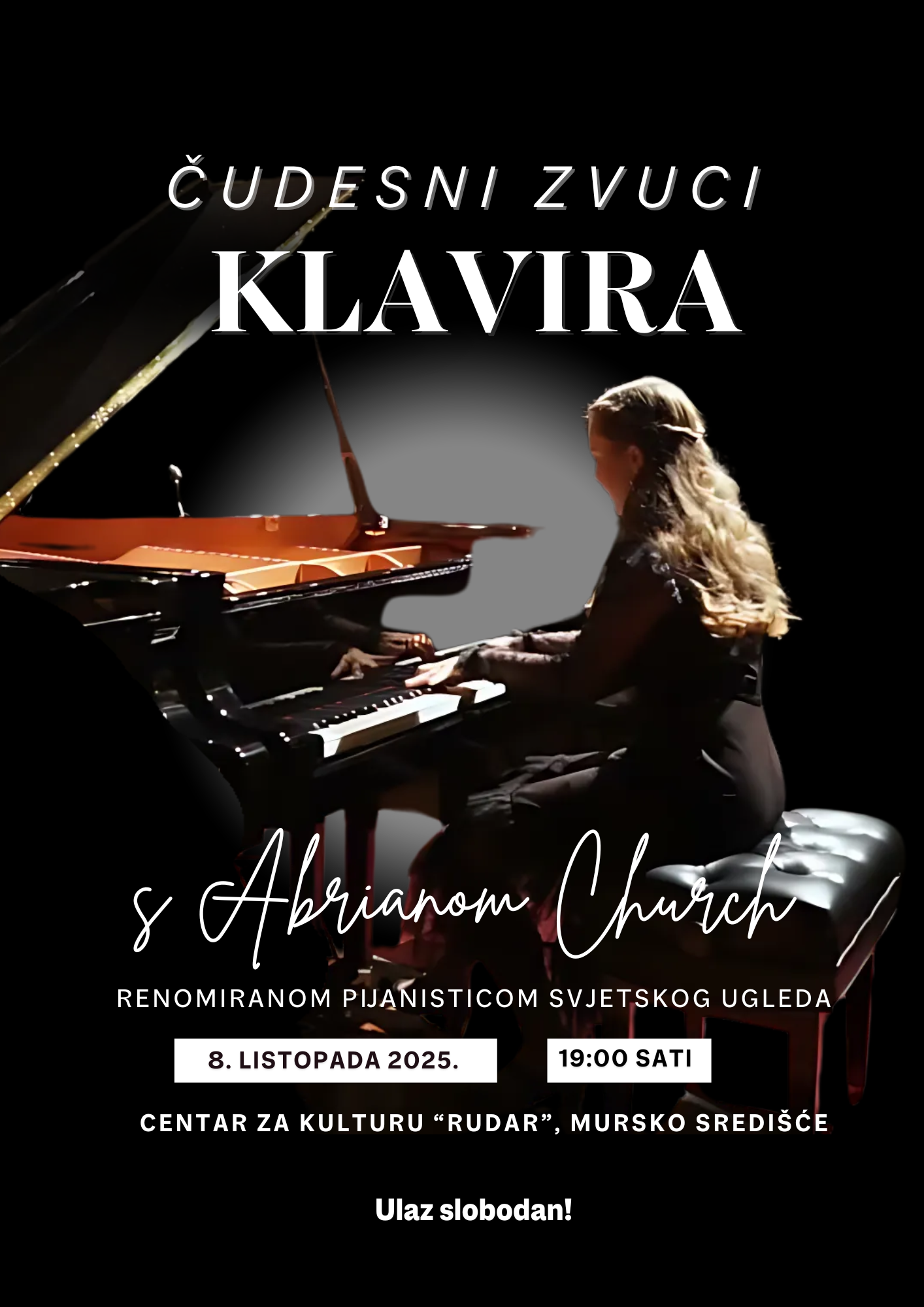 Čudesni zvuci klavira naslov je koncerta Abriane Church, poznate pijanistice, koji će se održati u Centru za kulturu „Rudar“ u srijedu, 8. listopada, s početkom u 19:00 sati.
