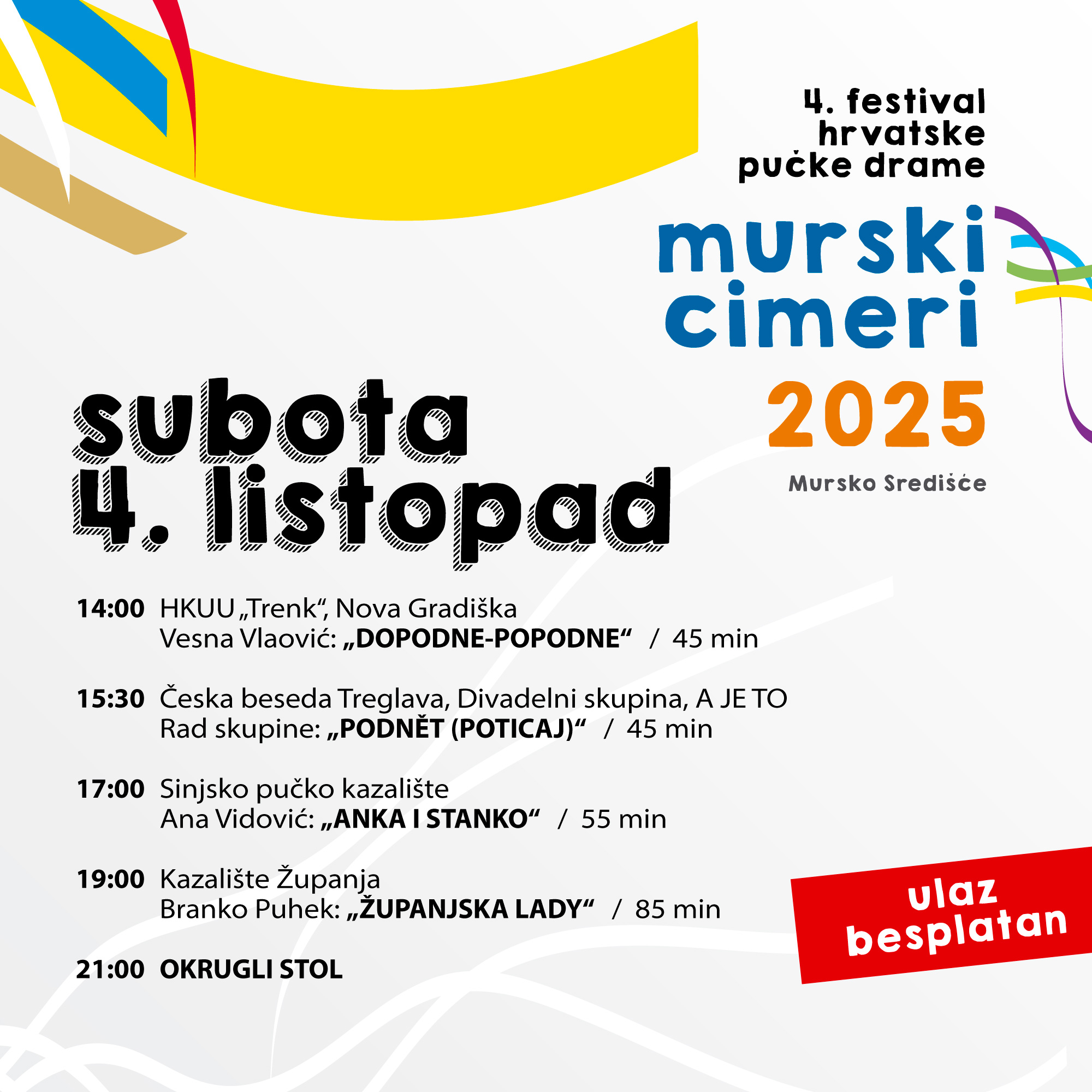 Program drugog dana Četvrtkog festivala hrvatske pučke drame – Murski cimeri započinje u 14.00 sati predstavom „Dopodne – popodne“ HKUU Trenk iz Nove Gradiške i traje do 21.00 sat kad je na rasporedu okrugli stol.