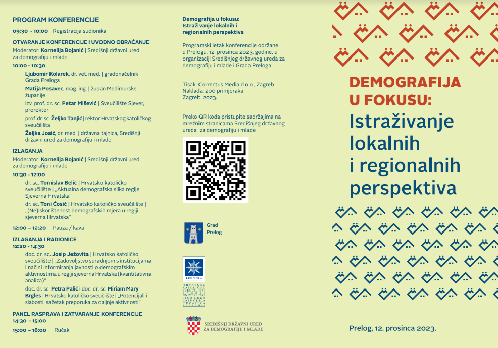 Središnji ured za demografiju i mlade Republike Hrvatske u suradnji s Hrvatskim katoličkim sveučilištem, održat će, u utorak 12. prosinca, u prostoru Poduzetničkog centra Prelog konferenciju pod nazivom: "Demografija u fokusu: Istraživanje lokalnih i regionalnih perspektiva"