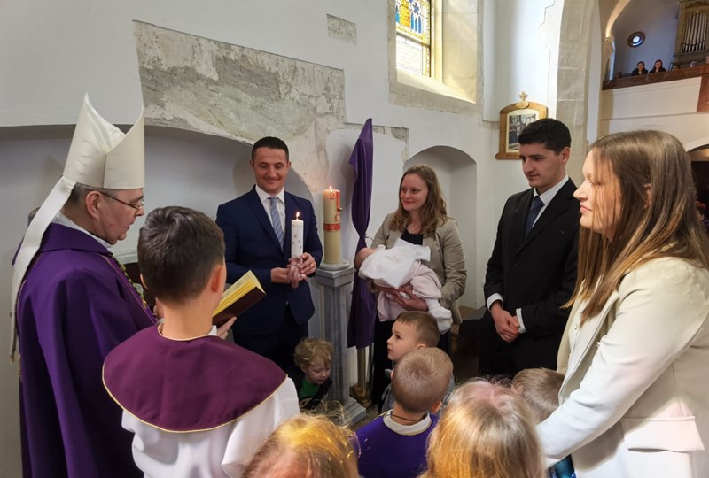 Varaždinski biskup Bože Radoš, na petu korizmenu nedjelju, 6. travnja 2025., tijekom nedjeljnog misnog slavlja župe sv. Martina biskupa u Svetom Martinu na Muri, krstio je malenu Mariju, šesto dijete Mire i Karle Spajić