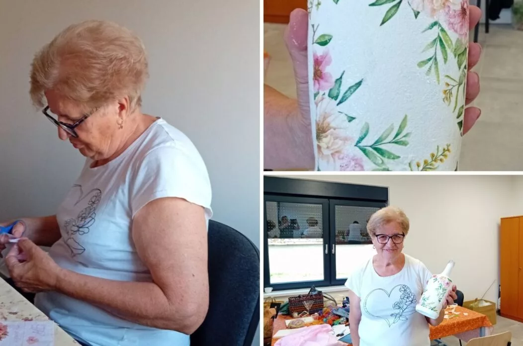 „Prvi put radim dekupaž na staklu i toliko mi se sviđa da ću doći i sutra. Uživam u društvu i radu, ovo mi je zaista posebno iskustvo“, rekla nam je Marija dok je pažljivo rezala salvete koje je odabrala za ukrašavanje svoje staklene boce. Za ovu kreativnu radionicu ručnih radova pripremila je jednostavnu staklenu bocu, a njezine vrijedne ruke brzo su je pretvorile u pravo malo umjetničko djelo.