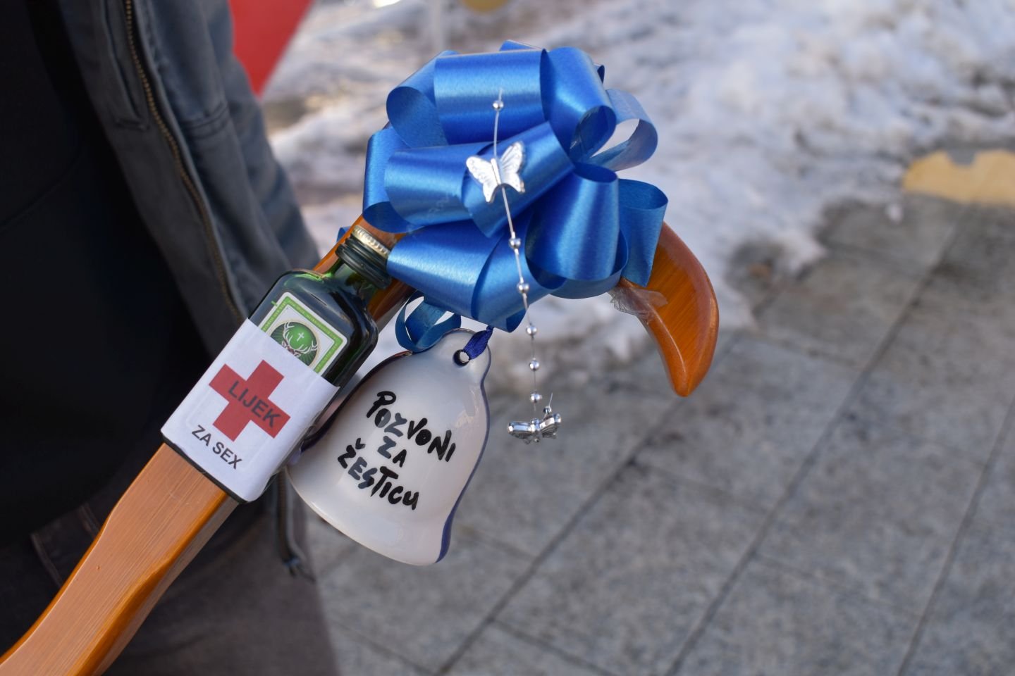 U rukama Leon Šarić nosio je štap sa zvoncem i simboličnim priborom za prvu pomoć, osmišljen kao humoristična poruka prijatelju koji ulazi u “svijet odraslih”.