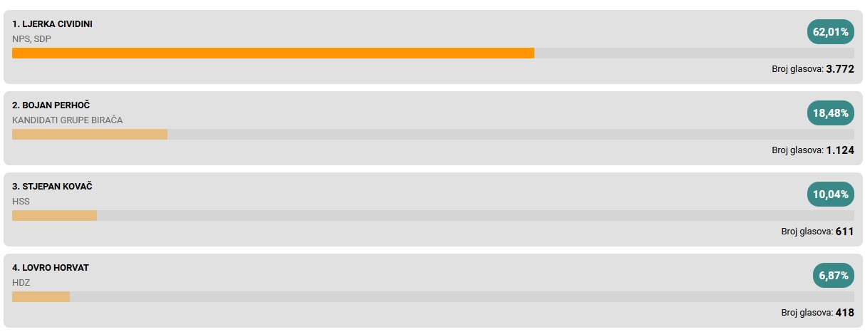Prema službenim rezultatima, Ljerka Cividini je osigurala drugi mandat bez potrebe za drugim krugom, što je veliki politički kapital uoči nove četiri godine vođenja grada. Doduše obrađeno je tek 75% biračkih mjesta.