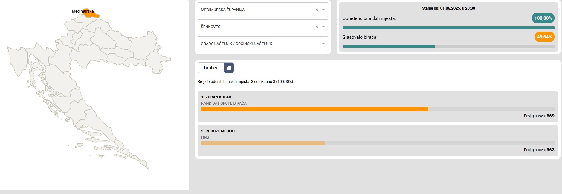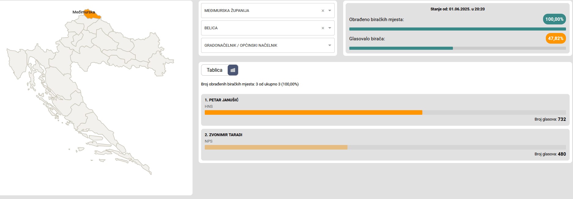 U nedjelju, 1. lipnja, održan je drugi krug lokalnih izbora u trima međimurskim općinama – Belici, Domašincu i Šenkovcu – gdje u prvom krugu nisu izabrani načelnici. Nakon zatvaranja birališta u 19 sati, Državno izborno povjerenstvo (DIP) objavilo je prve neslužbene rezultate već u 20 sati.